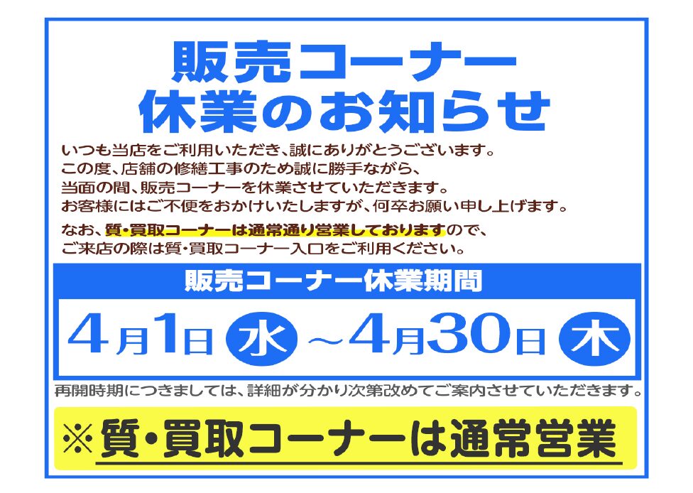 (質・買取最終受付:18:30)(販売コーナー:休業)