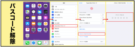 Touch IDとパスコード⇒パスコードをオフにする⇒パスコード入力