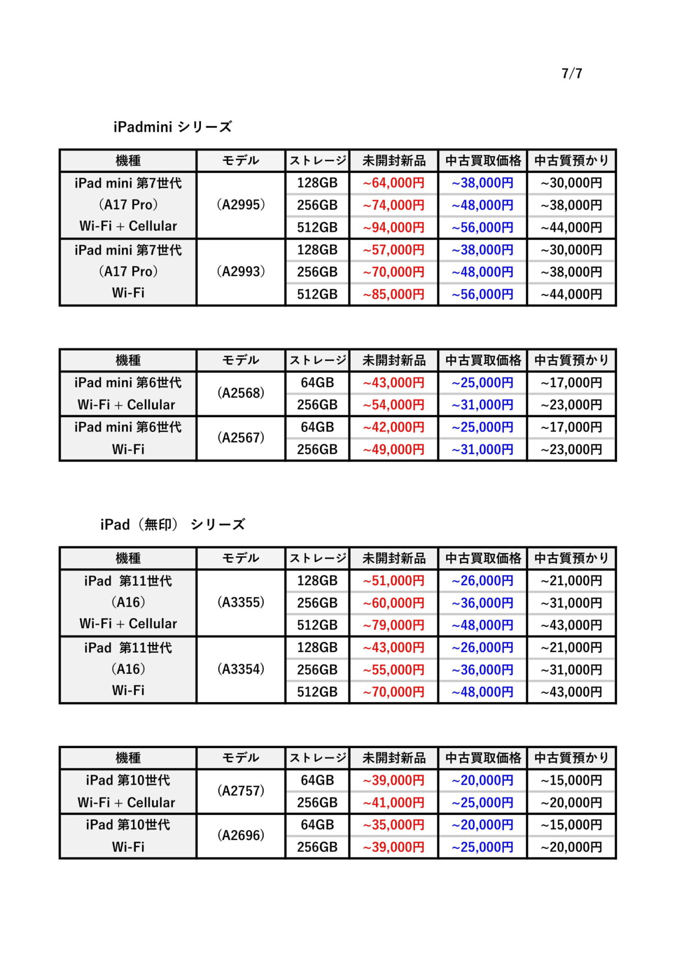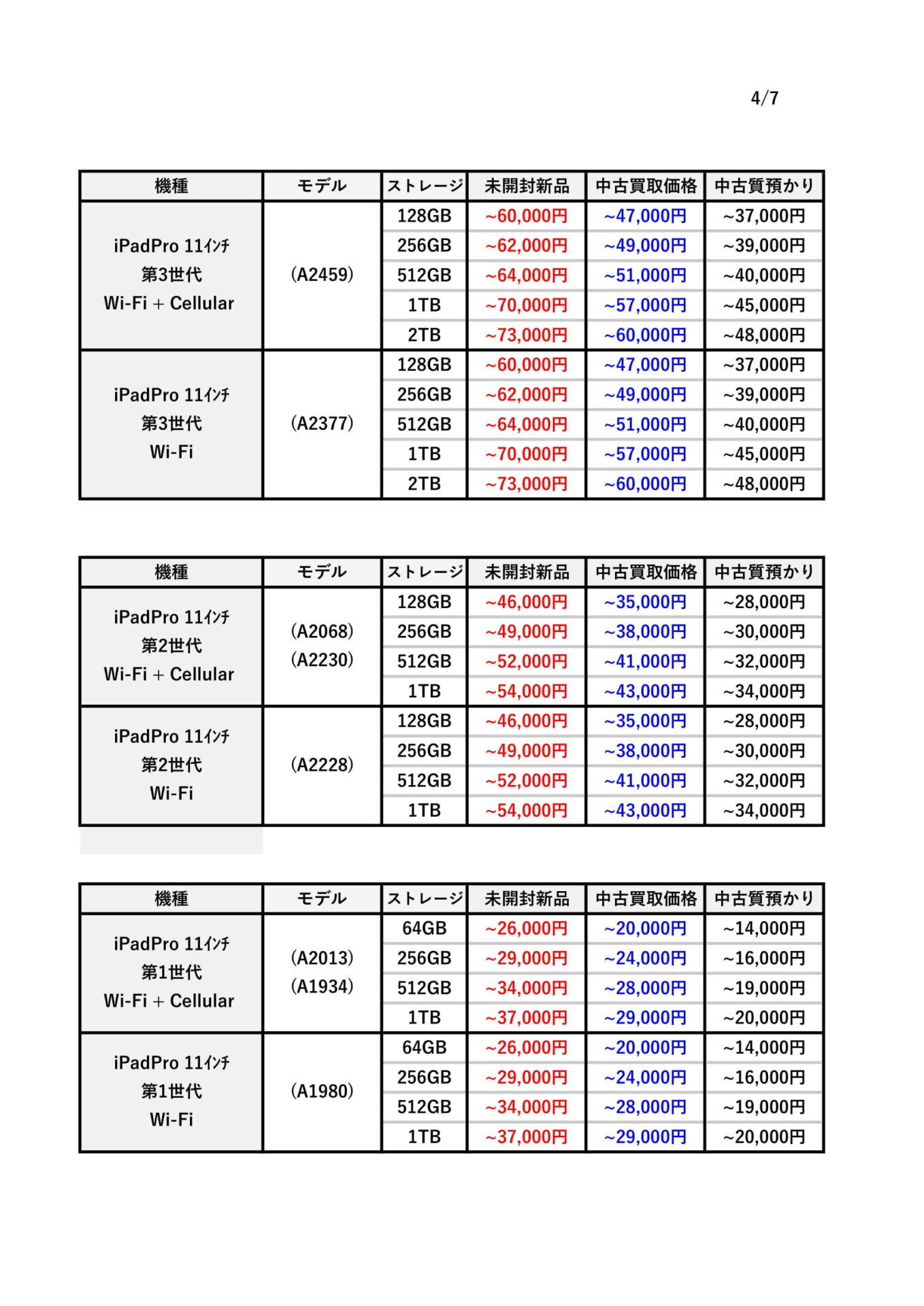 iPadの買取価格と質預かり金額一覧表