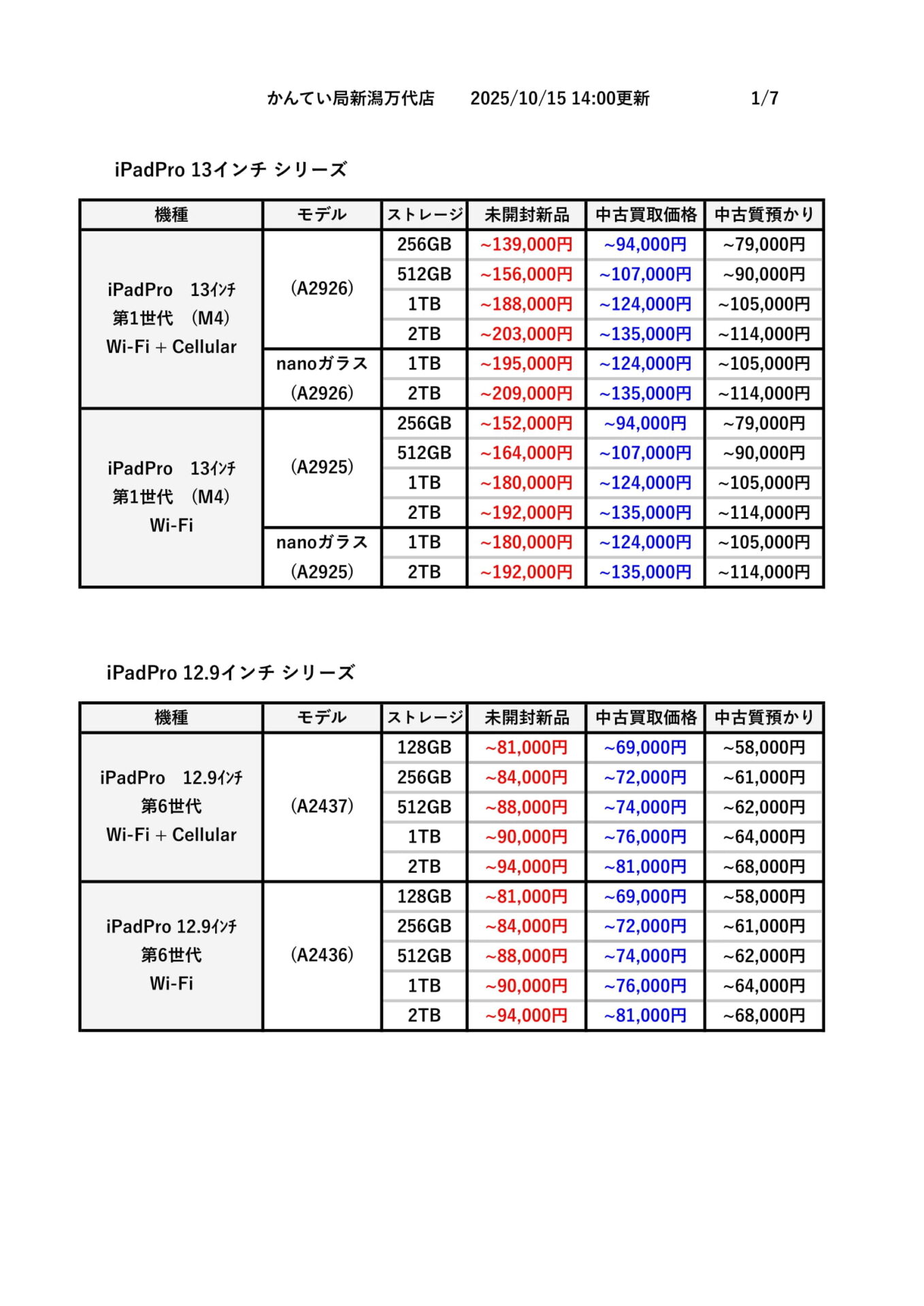 ※こちらはかんてい局新潟万代店の価格となり、相場や在庫状況等によって買取価格が変動することがございます。