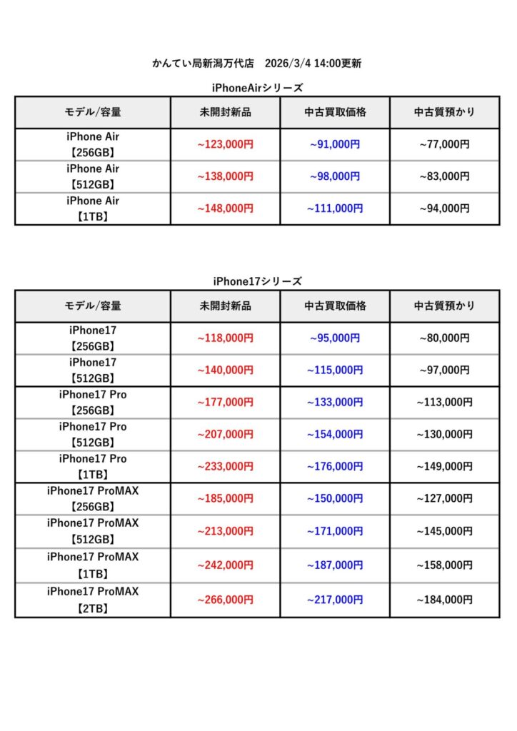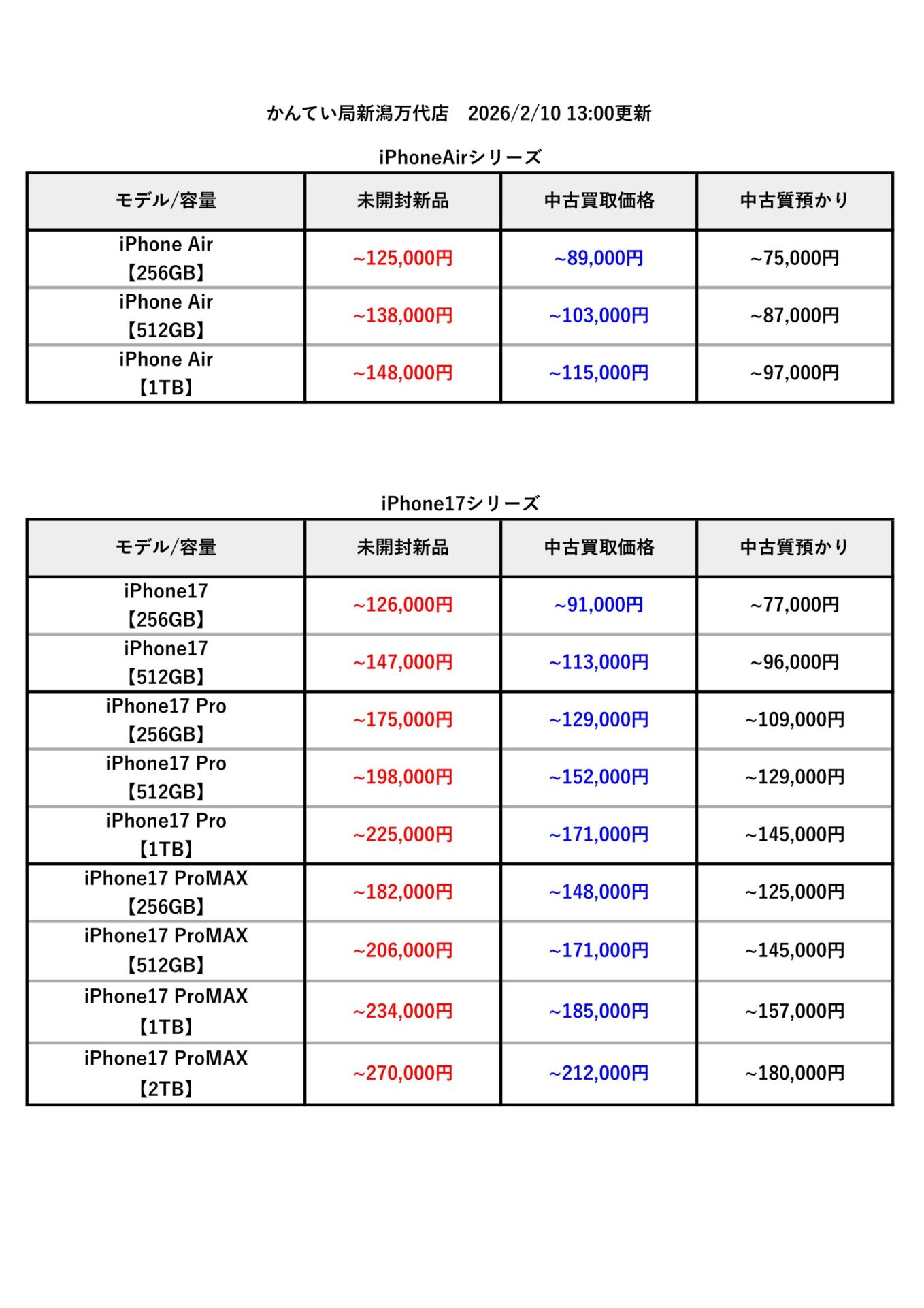 【2026年最新】iPhone17・Air含む歴代モデルの買取価格&質預かり相場を完全公開【新潟万代店】