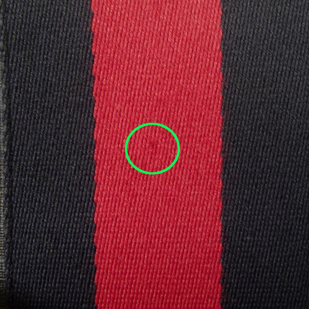 今回はバッグ中央の「ウェブストライプ(紺と赤のライン部分)」にはごくわずかなダメージが見られ、底の角部分には擦れがあったのが、マイナス評価となりました。