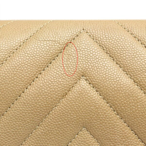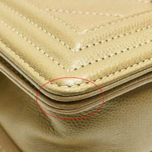 キャビアスキンは傷がつきにくい素材ですが、ベージュカラーは角スレが白っぽく見えやすいため、査定ではマイナス要素になります。 ただし、致命的なダメージではなく、Bランクとしては一般的な使用感の範囲です。