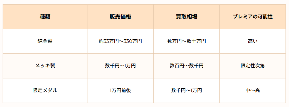 ■金メッキコイン:比較的安価で入手しやすいが、プレミアは限定数や状態に左右されます。