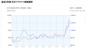 また、過去5年の価格推移を見てみると、赤線が参考小売価格ですが、緩やかに上がってきたプラチナ価格が、2025年下半期から急上昇していますね!