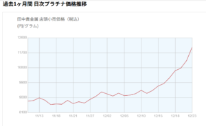 田中貴金属のプラチナ価格推移を見てみると一目瞭然で、12月10日頃から10日間で倍以上に値上がりしていることがわかります。