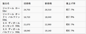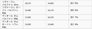 人気フレグランスの新価格と値上げ率の一部はこちら