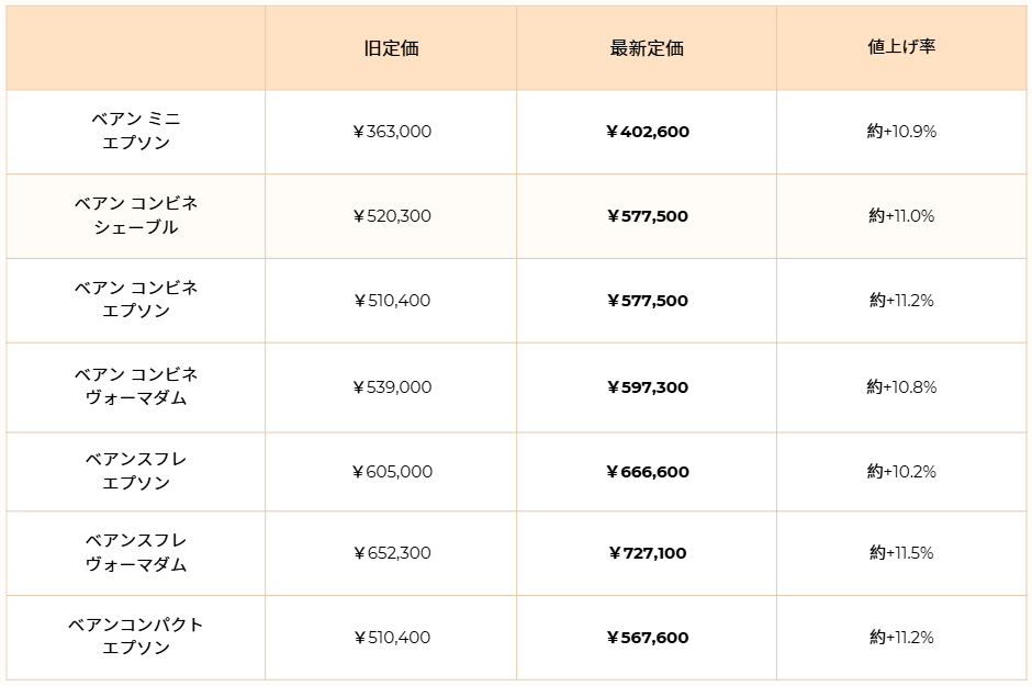 ベアンシリーズの定価
