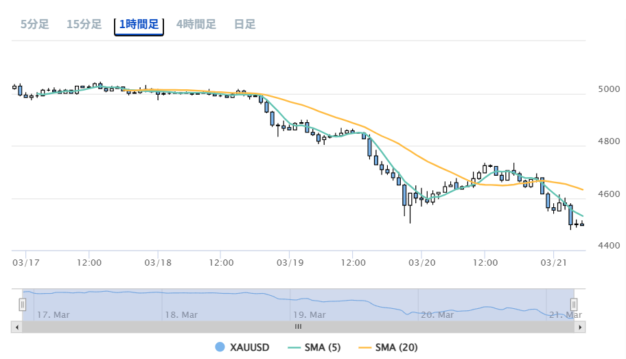 1000円程度の幅で下落したり、上昇したりという動きを見せたこともありましたが、2026年3月18日頃から金価格は大きく下落しています。