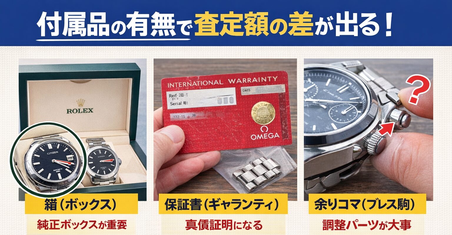 →特に高級時計に関しては、付属品がないだけで何十万円も減額してしまう可能性もあります。