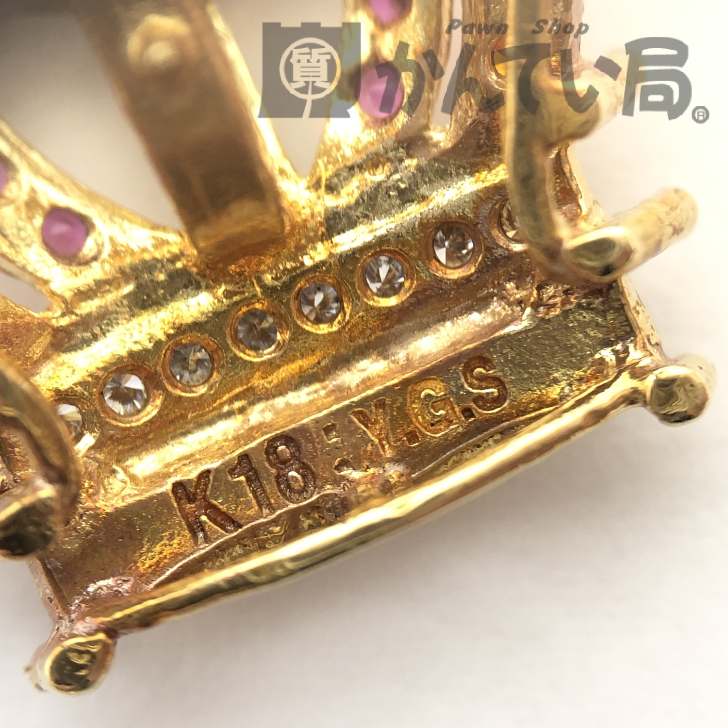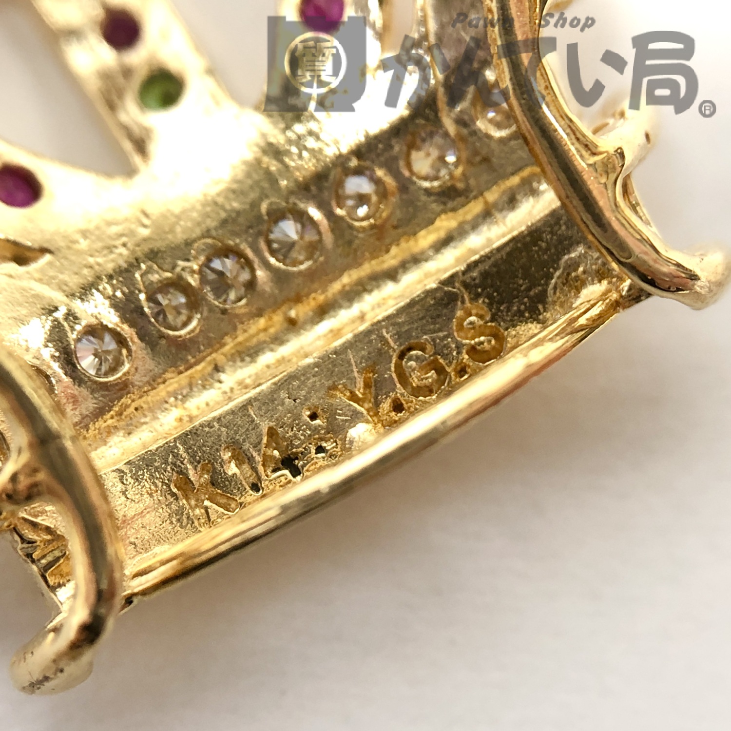 今回お持ちいただいたお品物はペンダントトップとピンブローチの2種類だったのですが、本体裏面にあった素材を示す刻印はそれぞれ「K14:Y.G.S」「K18:Y.G.S」と印されていました。