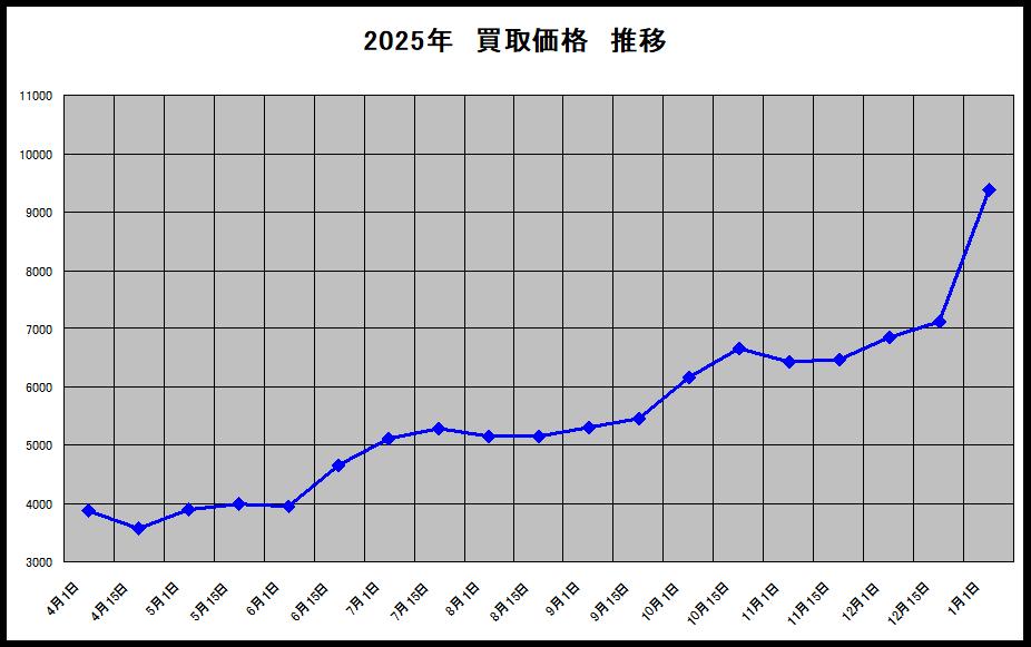 2025年4月1日時点ではPt850喜平の買取価格は1グラムあたり4,000円以下だったものが、2026年1月時点で9,000円以上となっています。