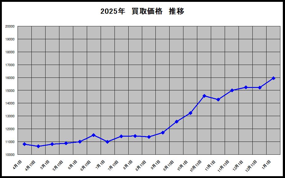 2025年4月1日時点ではK18喜平の買取価格は1グラムあたり11,000円以下だったものが、2026年1月時点で16,000円となっています。