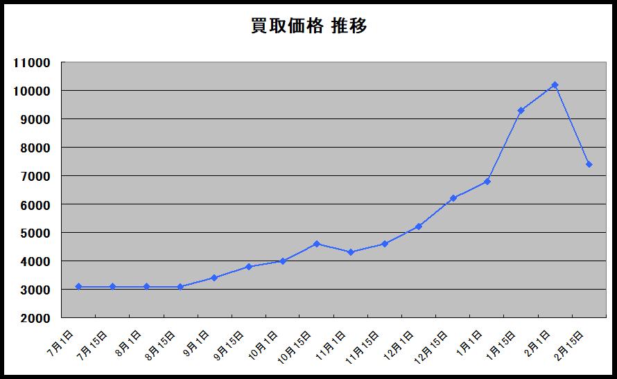 2025年の7月までの買取価格はおよそ3,000円前後でしたが、年末年始に向けて価格が上昇しており、2月の初めから徐々に下がりましたがまた少し持ち返したので現在は9,000円~10,000円前後となりました。