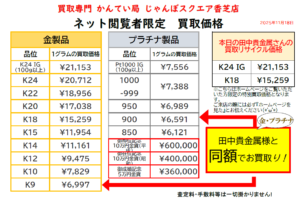 2025/11/18お知らせ 【 速報 11/18】金・プラチナ 買取相場高騰中!ネット限定 本日限定価格 ネット価格での買取をご希望の方は、ご来店時に必ず「ホームページを見た」とスタッフへお申し出ください。お申し出がない場合は通常の査定価格でのご案内となりますので、ご了承ください。