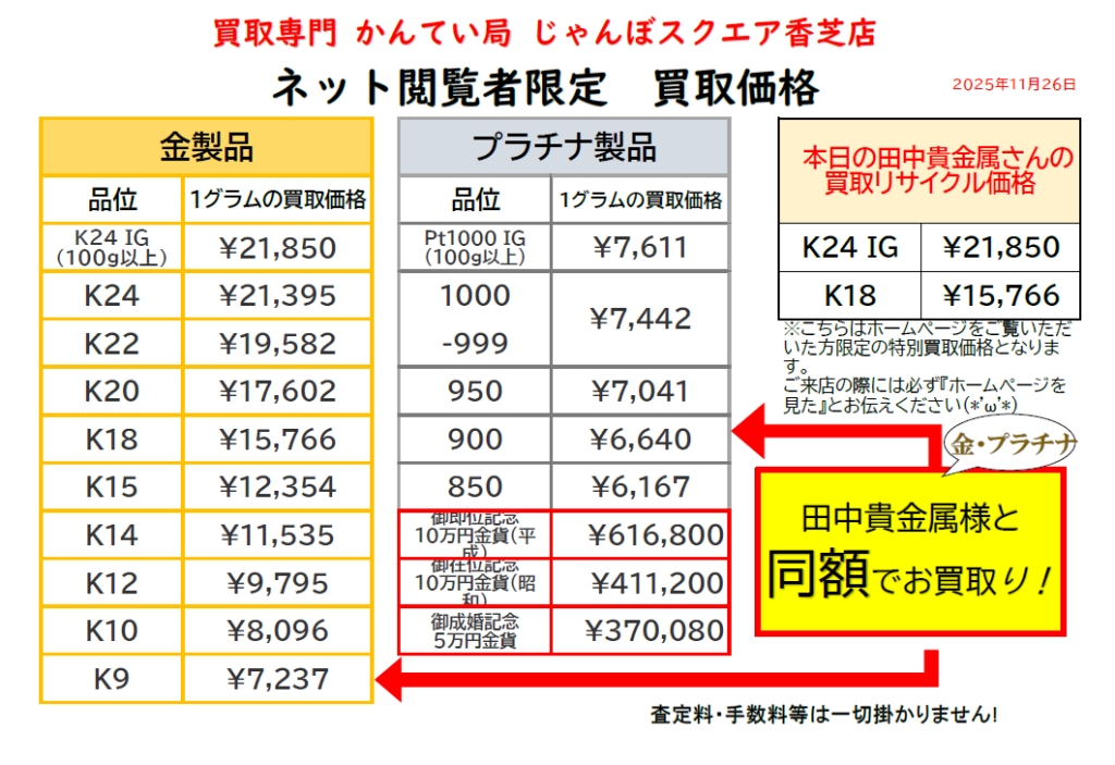 【 速報 11/26】金・プラチナ 買取相場高騰中!ネット限定 本日限定価格