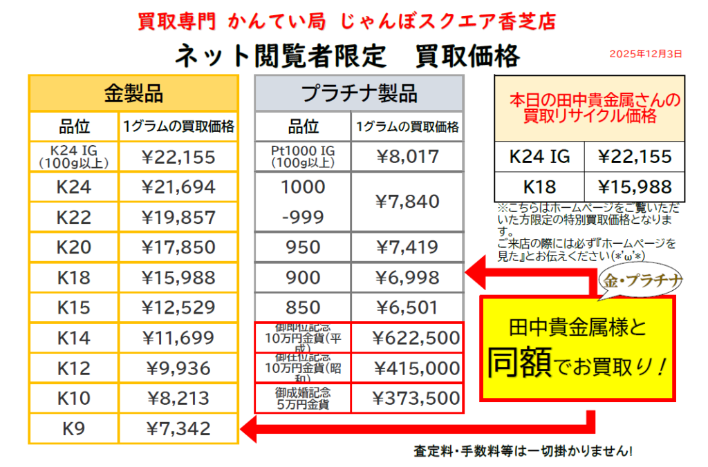 2025/12/03お知らせ 【 速報 12/3】金・プラチナ 買取相場高騰中!ネット限定 本日限定価格 ネット価格での買取をご希望の方は、ご来店時に必ず「ホームページを見た」とスタッフへお申し出ください。お申し出がない場合は通常の査定価格でのご案内となりますので、ご了承ください。