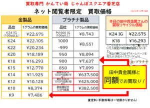 2025/12/16 【 速報 12月16日 火曜日 】金・プラチナ 買取相場高騰中!ネット限定 本日限定価格 ネット価格での買取をご希望の方は、ご来店時に必ず「ホームページを見た」とスタッフへお申し出ください。お申し出がない場合は通常の査定価格でのご案内となりますので、ご了承ください。