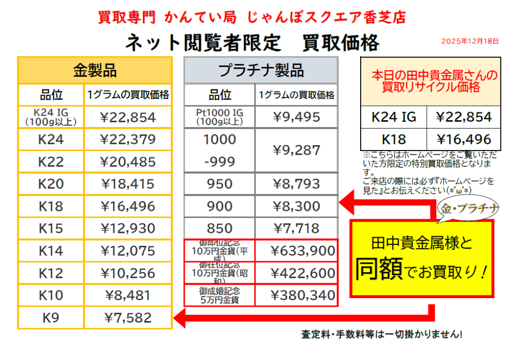 【 速報 12月18日 木曜日 】金・プラチナ 買取相場高騰中!ネット限定 本日限定価格