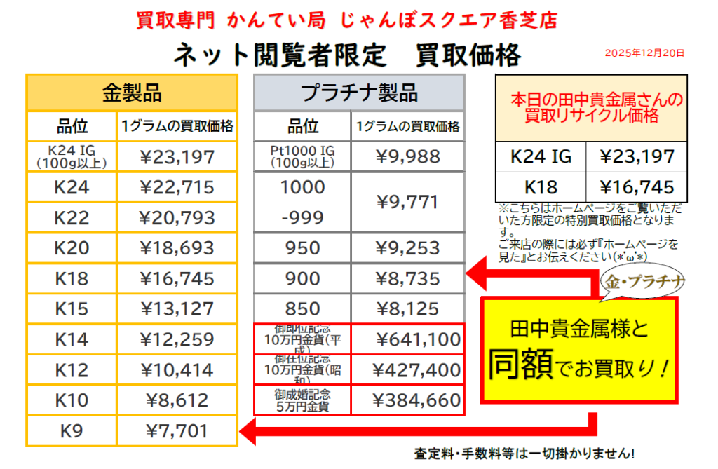 【 速報 12月20日 土曜日 】金・プラチナ 買取相場高騰中!ネット限定 本日限定価格