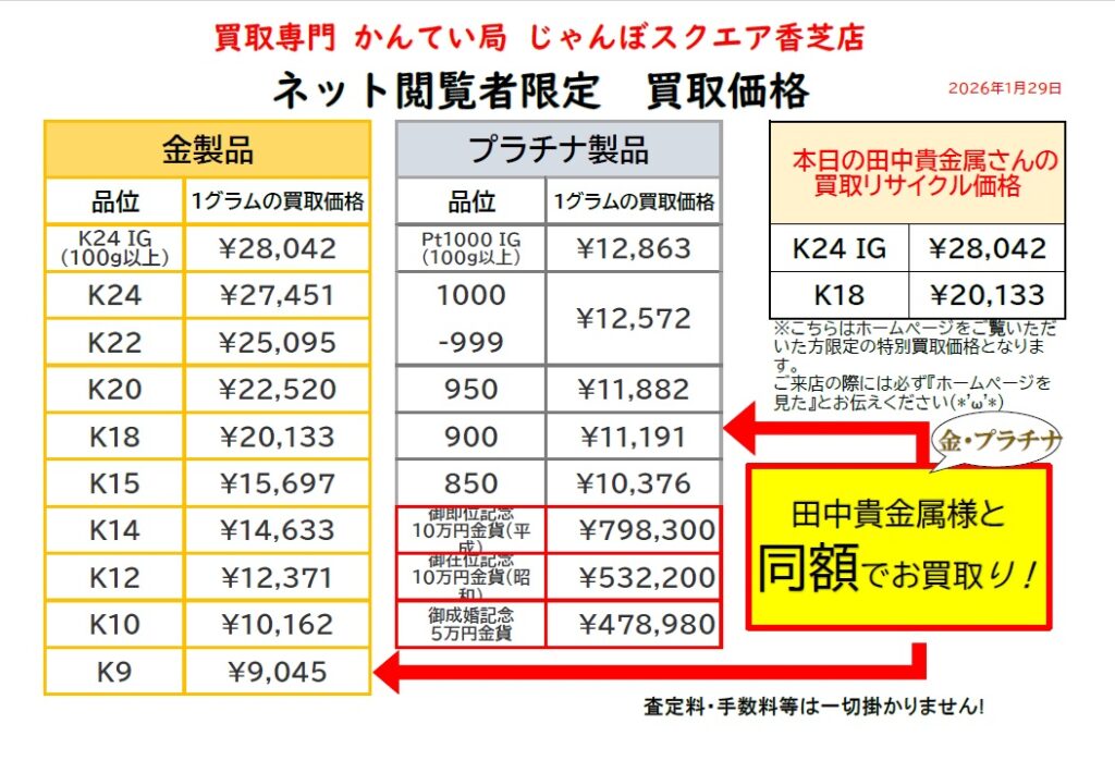 【1月29日】金・プラチナ 買取相場高騰中!ネット限定 本日限定価格