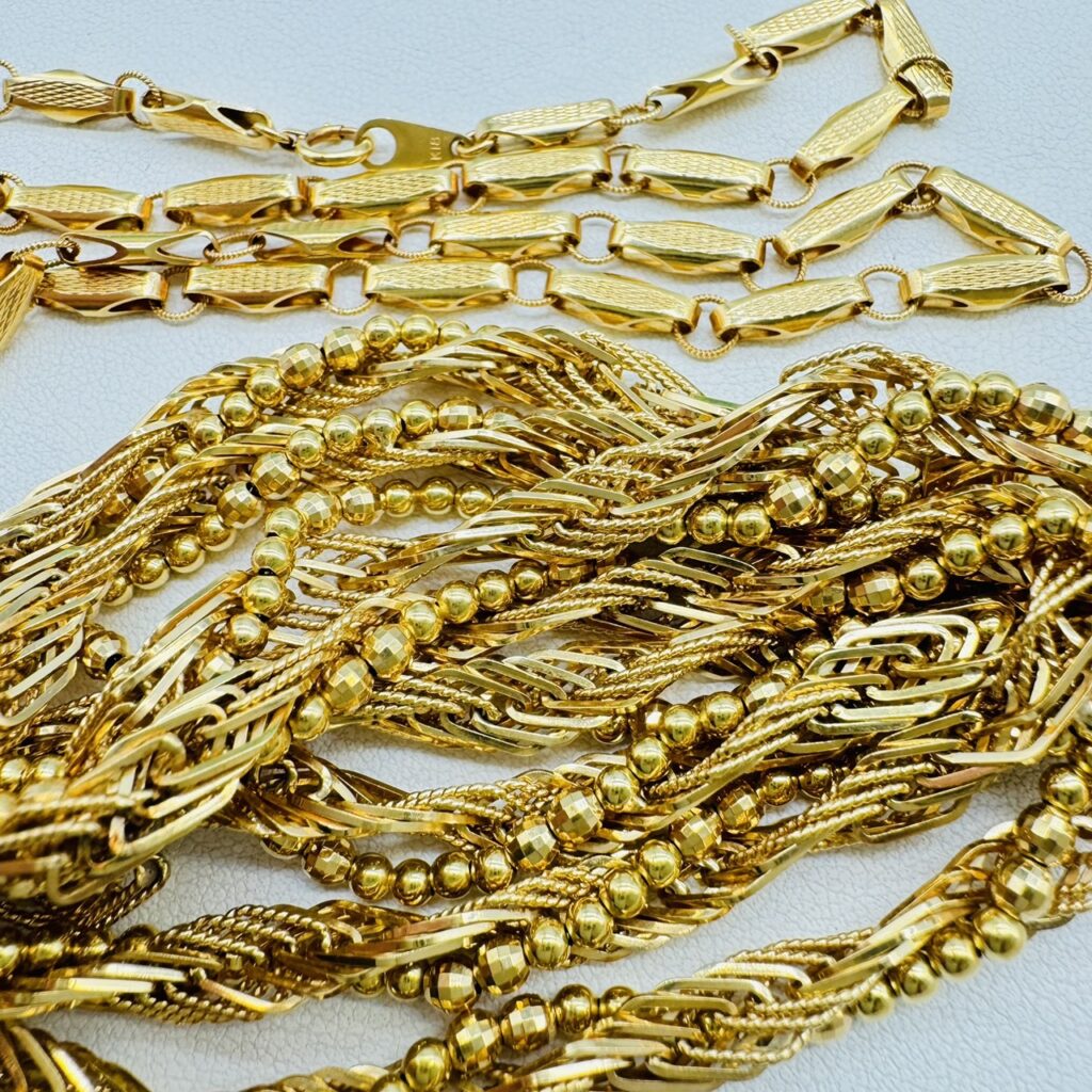 しかし、実際の買取現場で最も多く持ち込まれるのは、24金ではなく18金です。