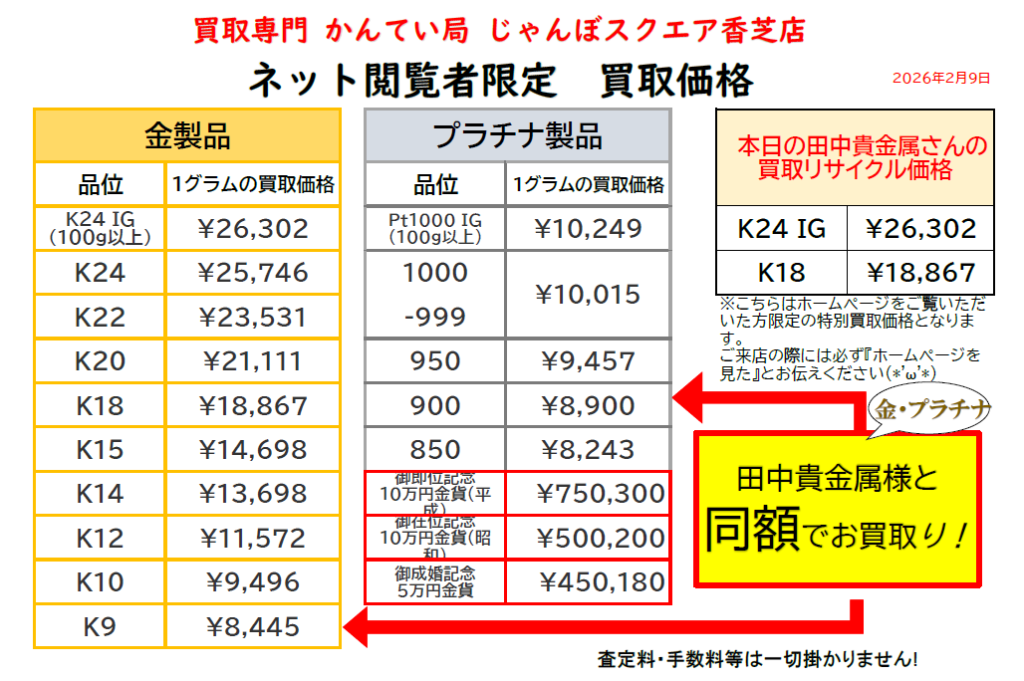 💰 本日の買取価格(2026年2月9日限定)品位1グラムの買取価格(税込)田中貴金属様と同額!