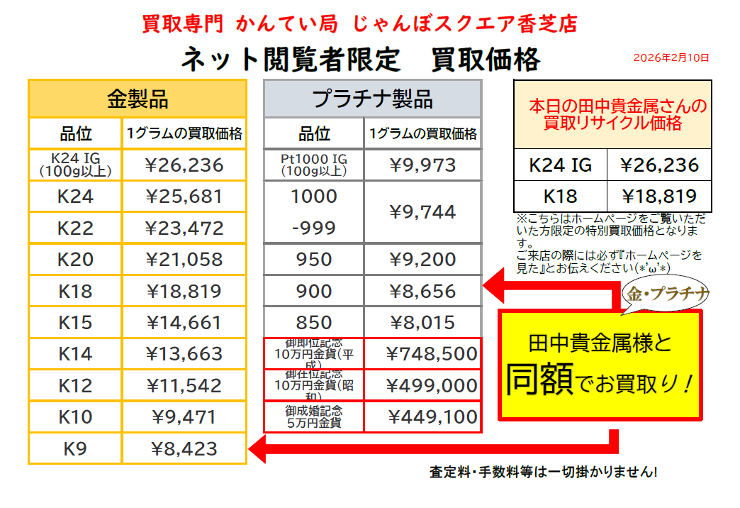 💰 本日の買取価格(2026年2月10日限定)品位1グラムの買取価格(税込)田中貴金属様と同額!