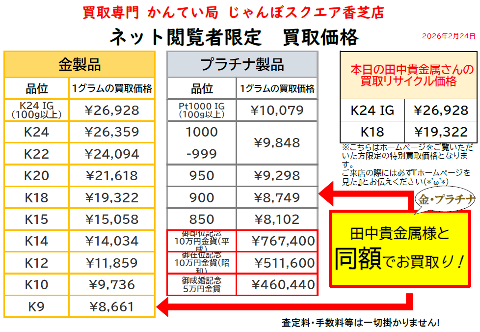 【2月24日・火曜日】金・プラチナ・ネット限定 本日限り買取価格!