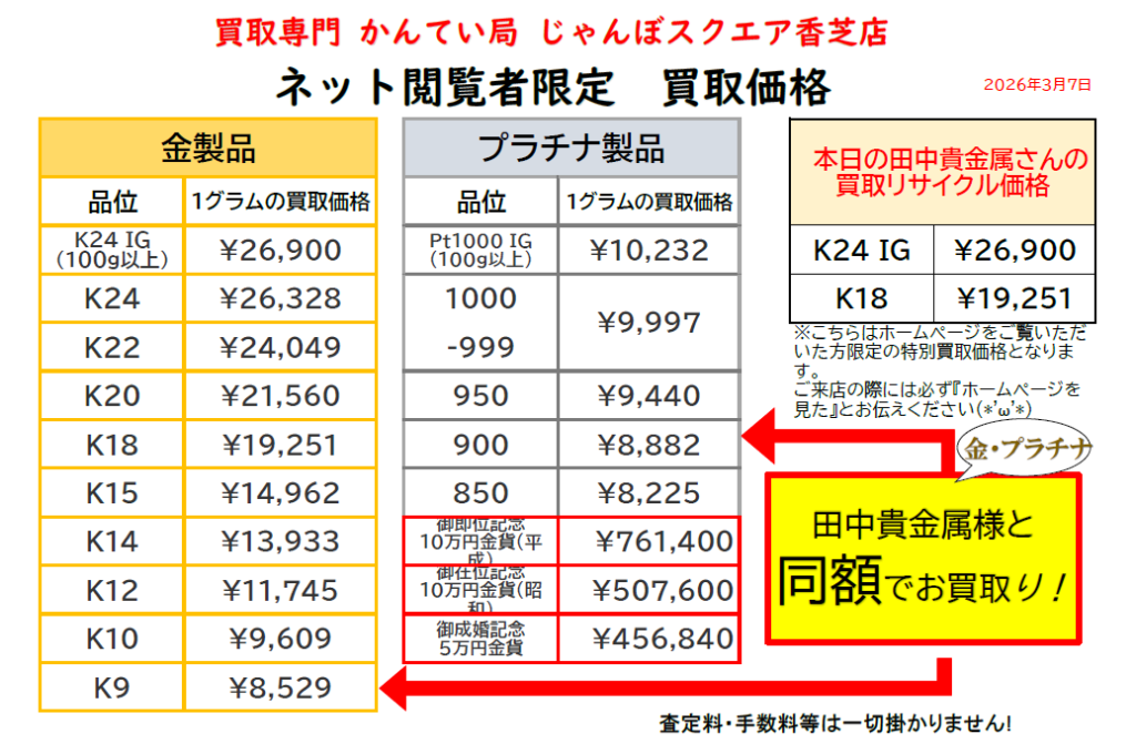 💰 本日の買取価格(2026年3月7日限定)品位1グラムの買取価格(税込)田中貴金属様と同額!