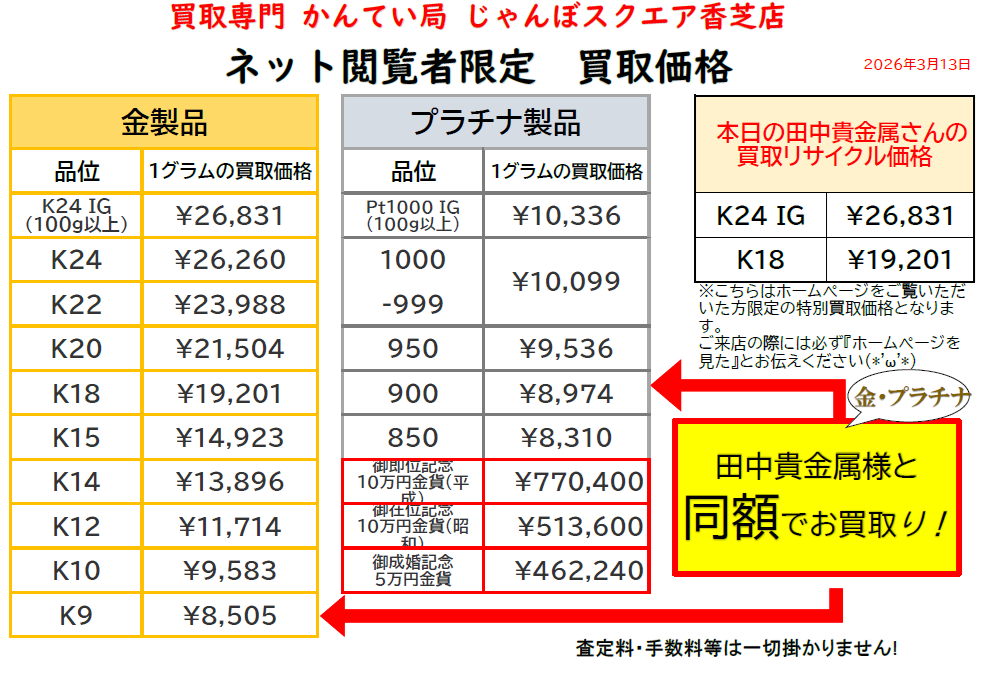 【3月13日・金曜日】金・プラチナ・ネット限定 本日限り買取価格!