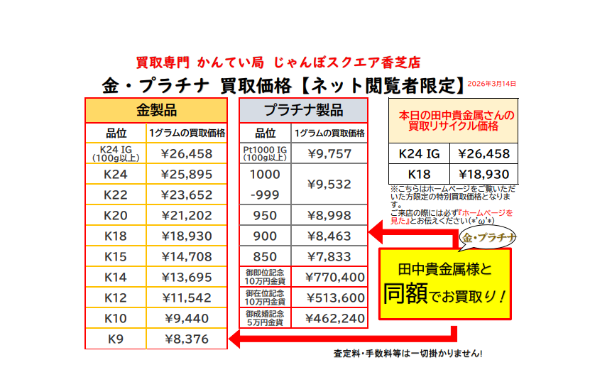 【3月14日・土曜日】金・プラチナ・ネット限定 本日限り買取価格!