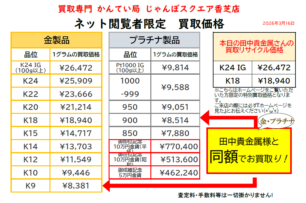 💰 本日の買取価格(2026年3月16日限定)品位1グラムの買取価格(税込)田中貴金属様と同額!