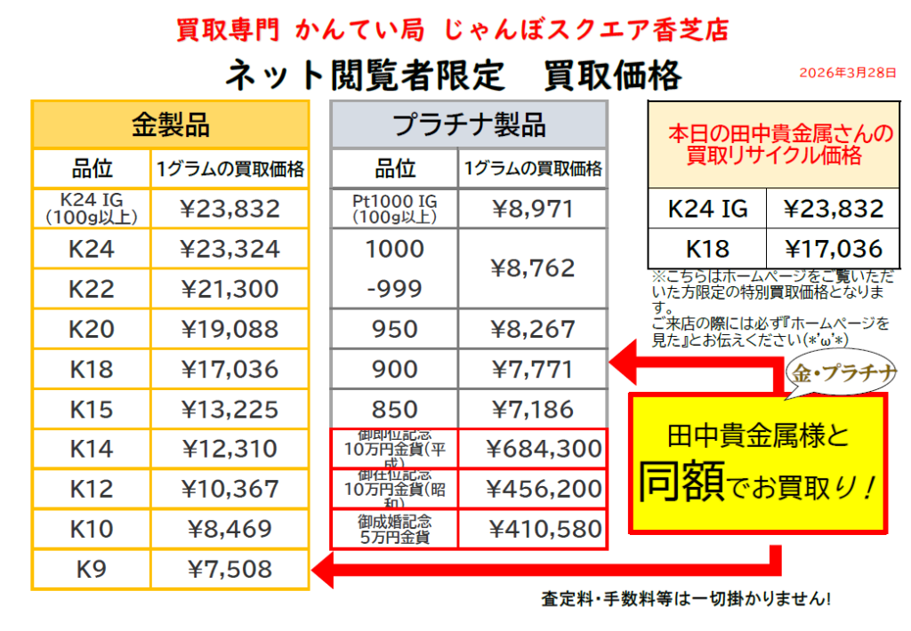 💰 本日の買取価格(2026年3月28日限定)品位1グラムの買取価格(税込)田中貴金属様と同額!