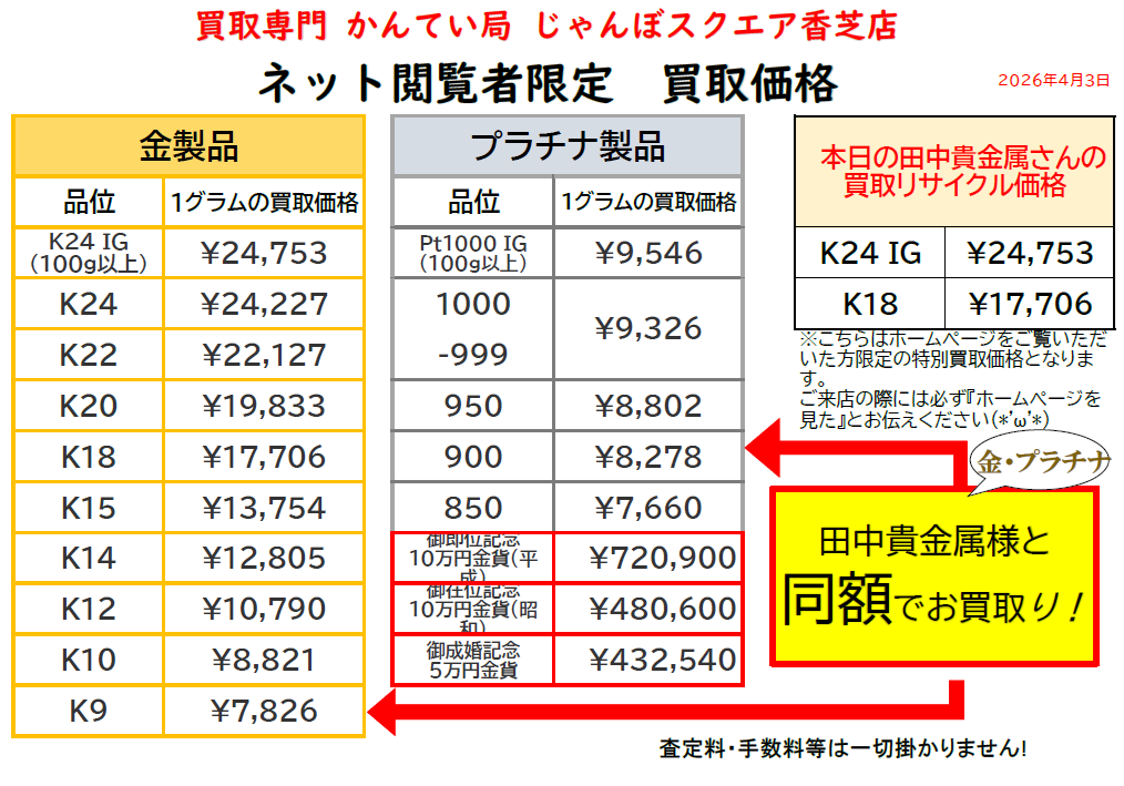 【4月3日・金曜日】金・プラチナ・ネット限定 本日限り買取価格!