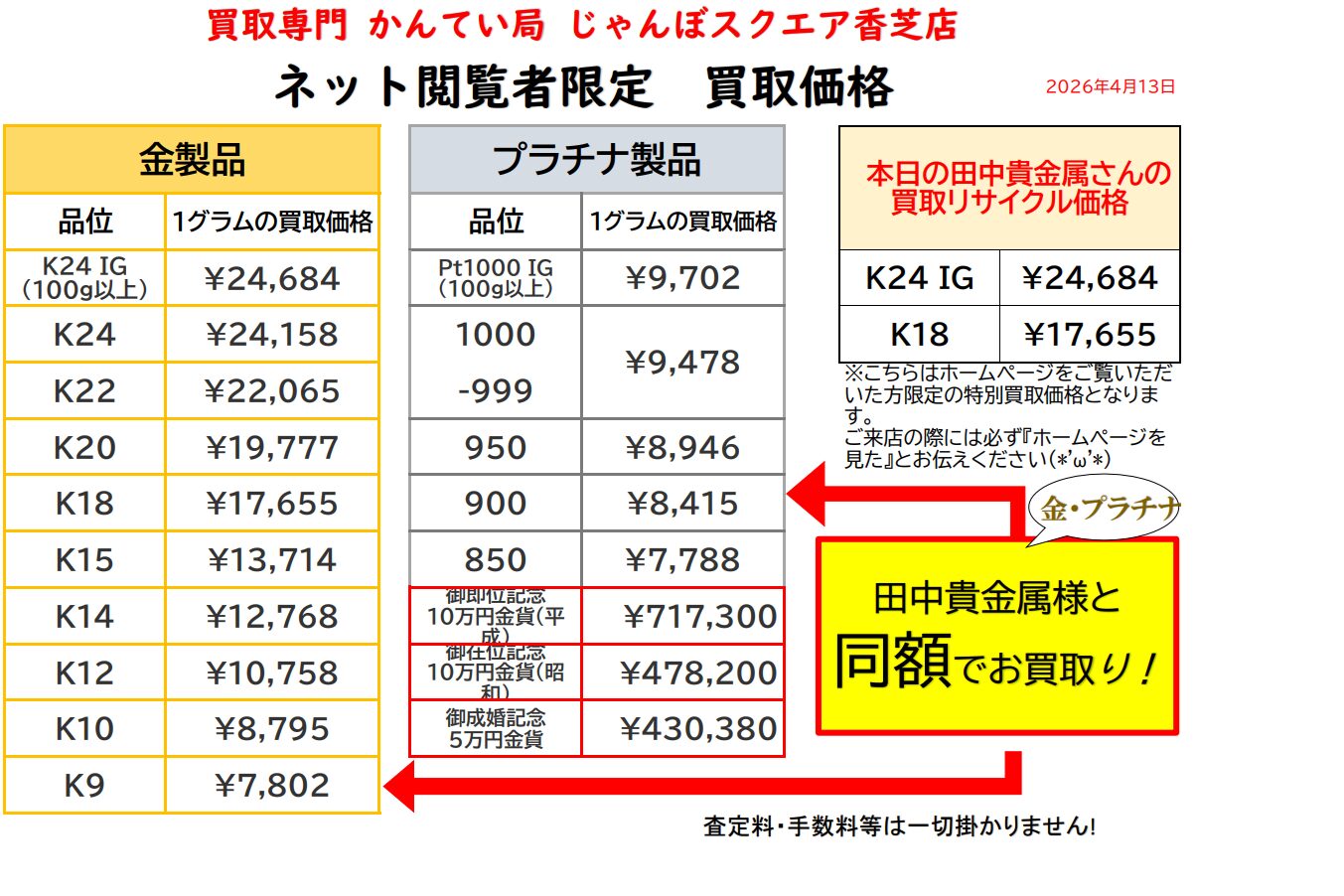【4月13日・月曜日】金・プラチナ・ネット限定 本日限り買取価格!