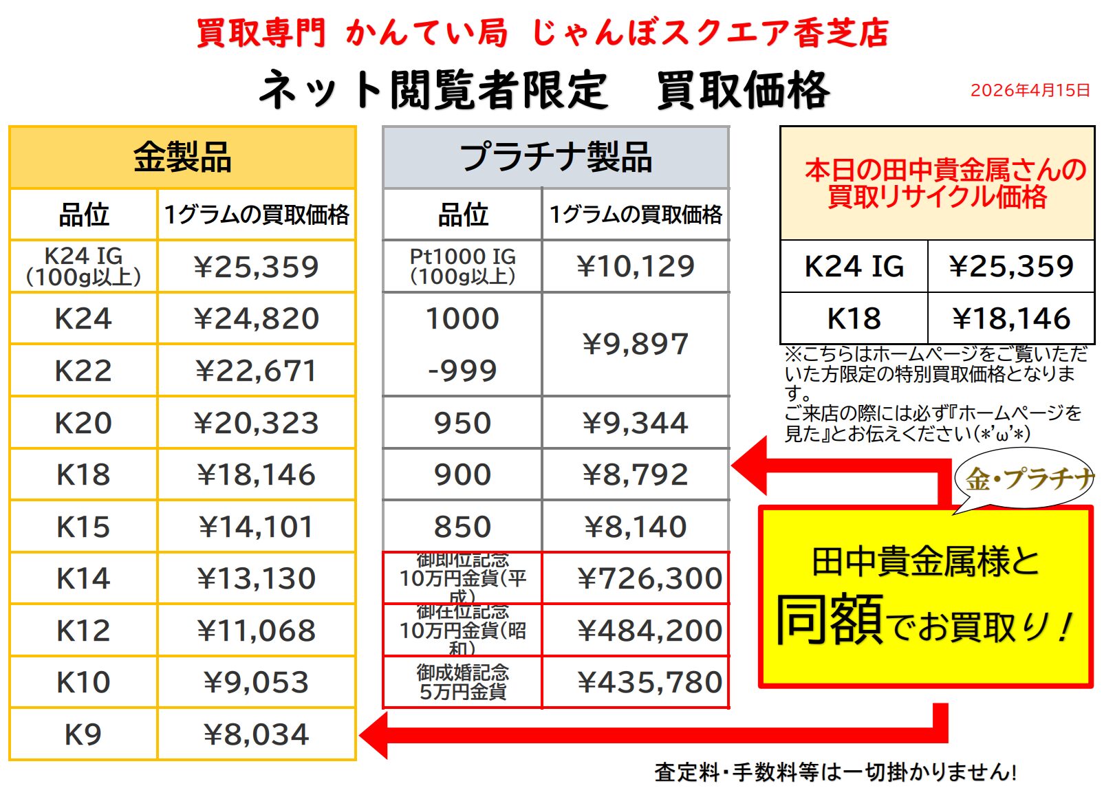 【4月15日・水曜日】金・プラチナ・ネット限定 本日限り買取価格!