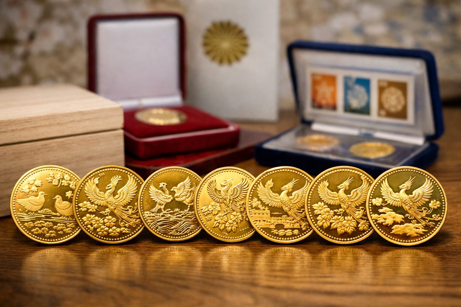 天皇陛下御在位、御即位、ご成婚記念金貨には、主に7種類の代表的な金貨があります。御在位60年記念10万円金貨、御即位記念10万円金貨、皇太子殿下御成婚記念5万円金貨、御在位10年・20年・30年記念1万円金貨、そして令和の御即位記念1万円金貨です。発行年、グラム数、図柄が違うため、まずは一覧と画像で確認することが大切です。