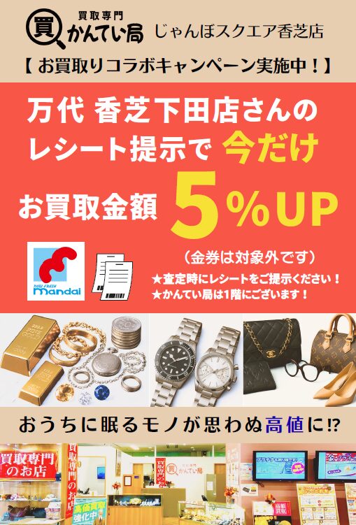 かんてい局じゃんぼスクエア香芝店では、ブランド品から小物、バッグ、時計、ジュエリー
