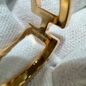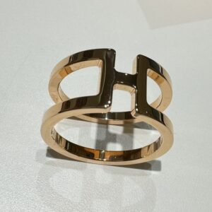 エルメスの頭文字である「H」を立体的にデザインした、存在感抜群のスカーフリングです。 2本のリングが「H」の文字で繋がったようなフォルムとゴールドの美しい光沢が、スカーフを通した際に華やかな印象を与えてくれます。