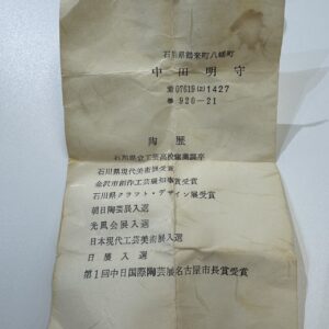 | 陶歴(しおり)付き | 作者の受賞歴などが書かれた紙。今回の中田明守氏のように輝かしい受賞歴がある方は評価大です! |