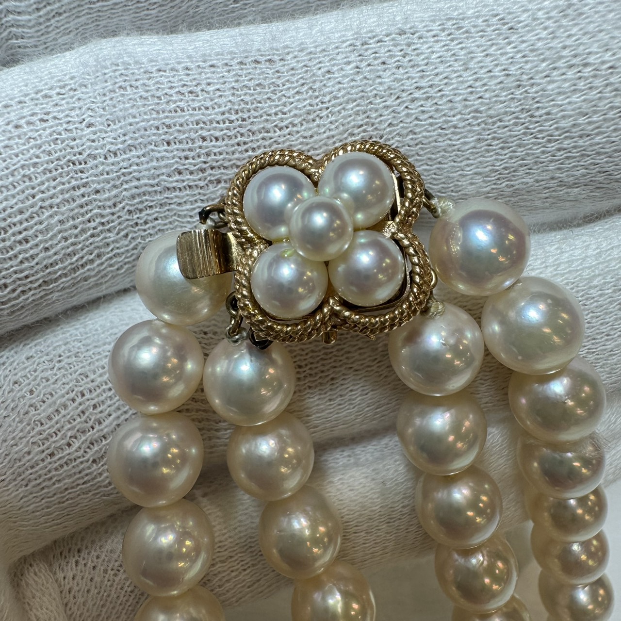 お持ち込みいただいたのは、テリ(光沢)が美しく、ボリューム感のある二連タイプのネックレスです。実はパールネックレスの査定において、真珠そのものの品質と同じくらい重要な「チェックポイント」があるのをご存知でしょうか?