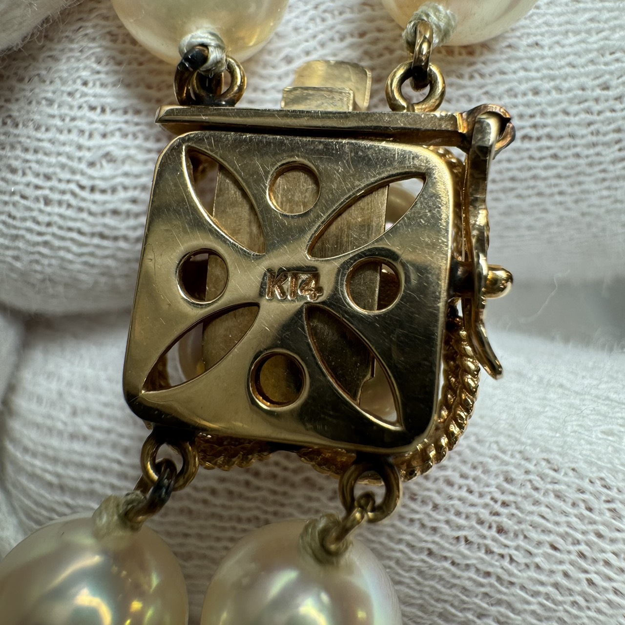 一般的に、冠婚葬祭用のパールネックレスの金具には「SILVER(銀製)」が使われることが多いです。しかし、今回お持ち込みいただいたお品物の金具には「K14(14金)」の刻印がありました。