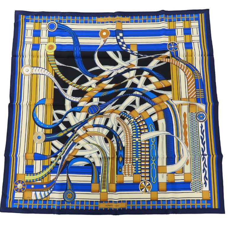 【Hermès(エルメス)カレ90 ヴォルト・エ・ピルエット(マリン×ゴールド×クレーム)】