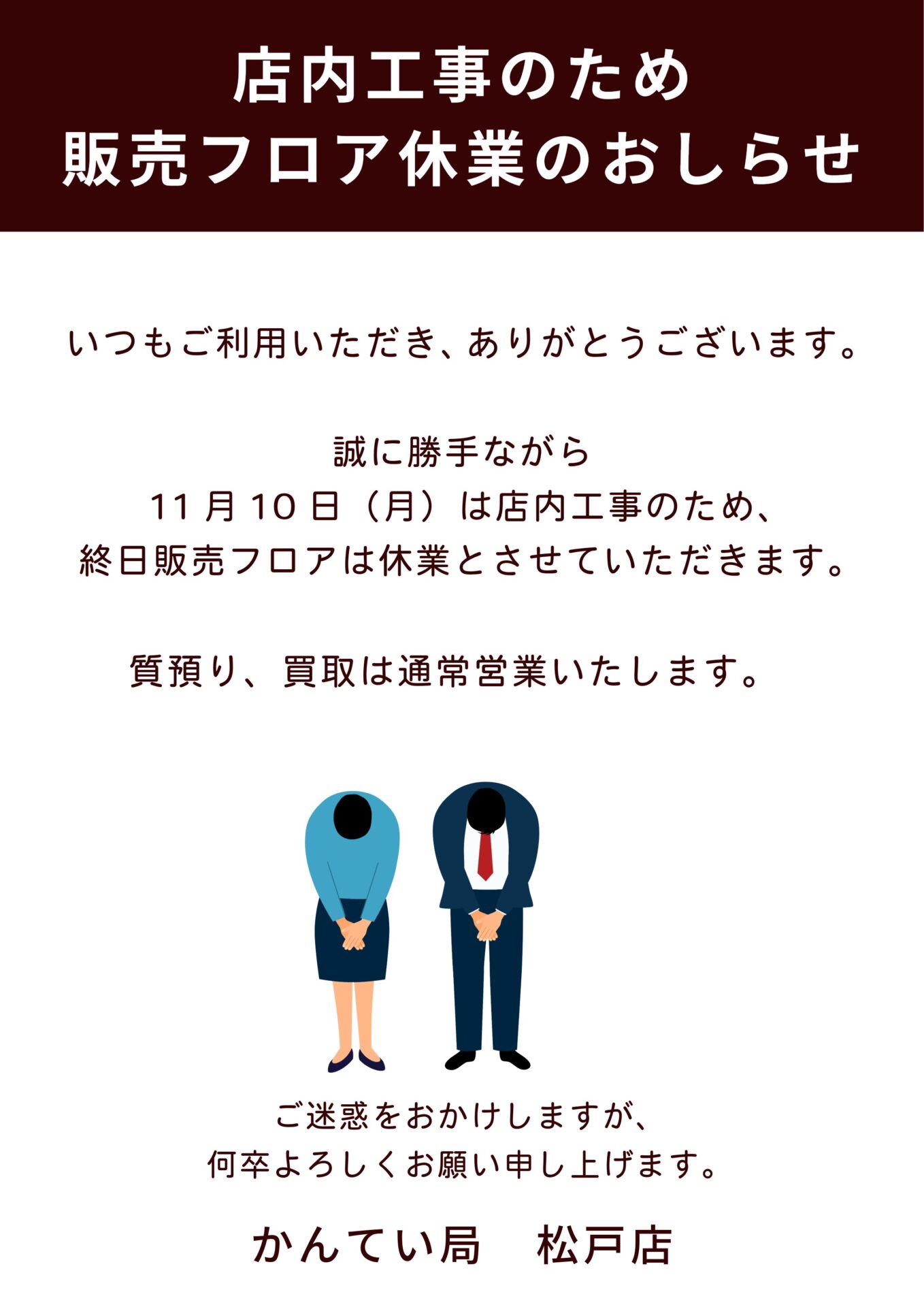 11月10日(月)は店内工事の為、終日販売フロアは休業とさせていただきます。