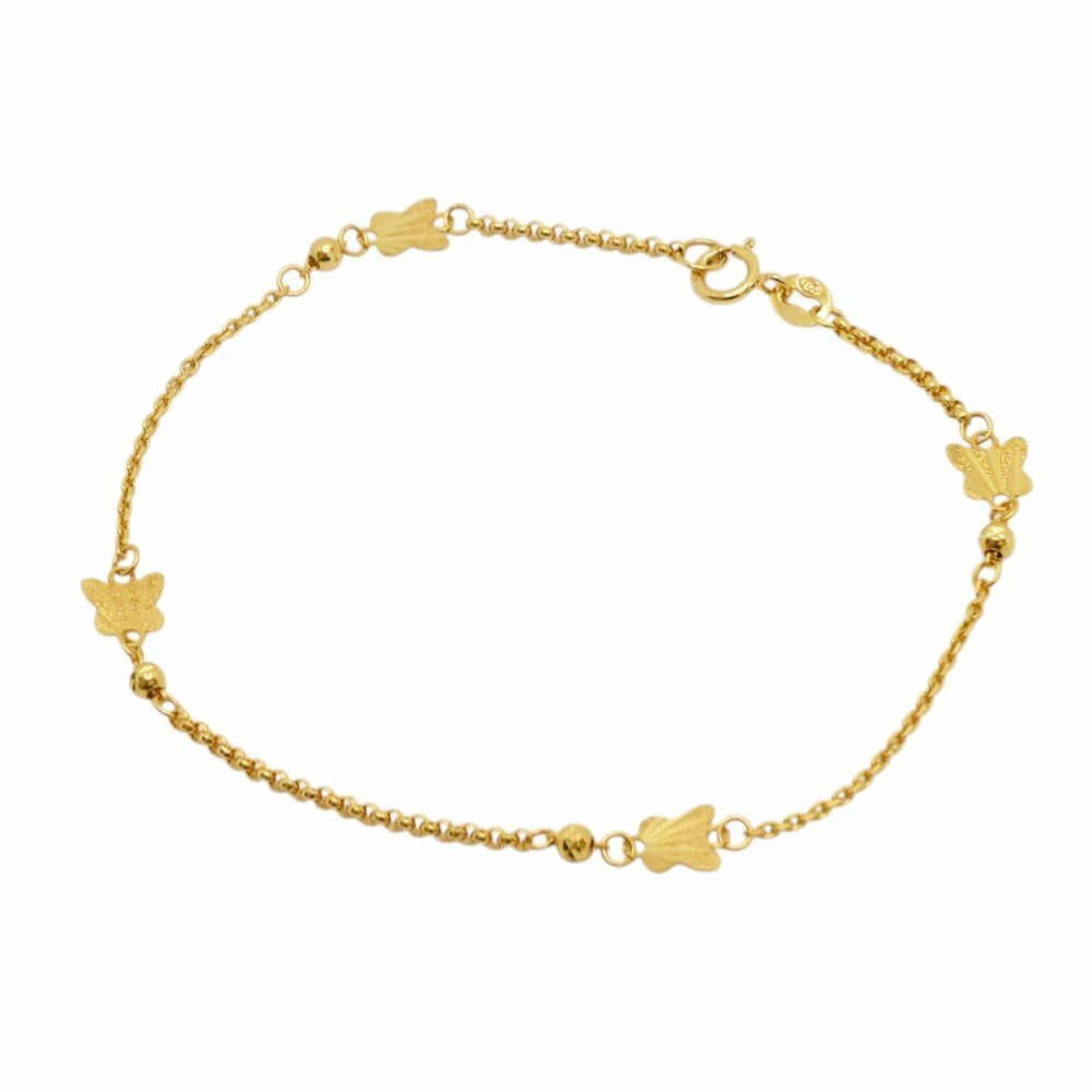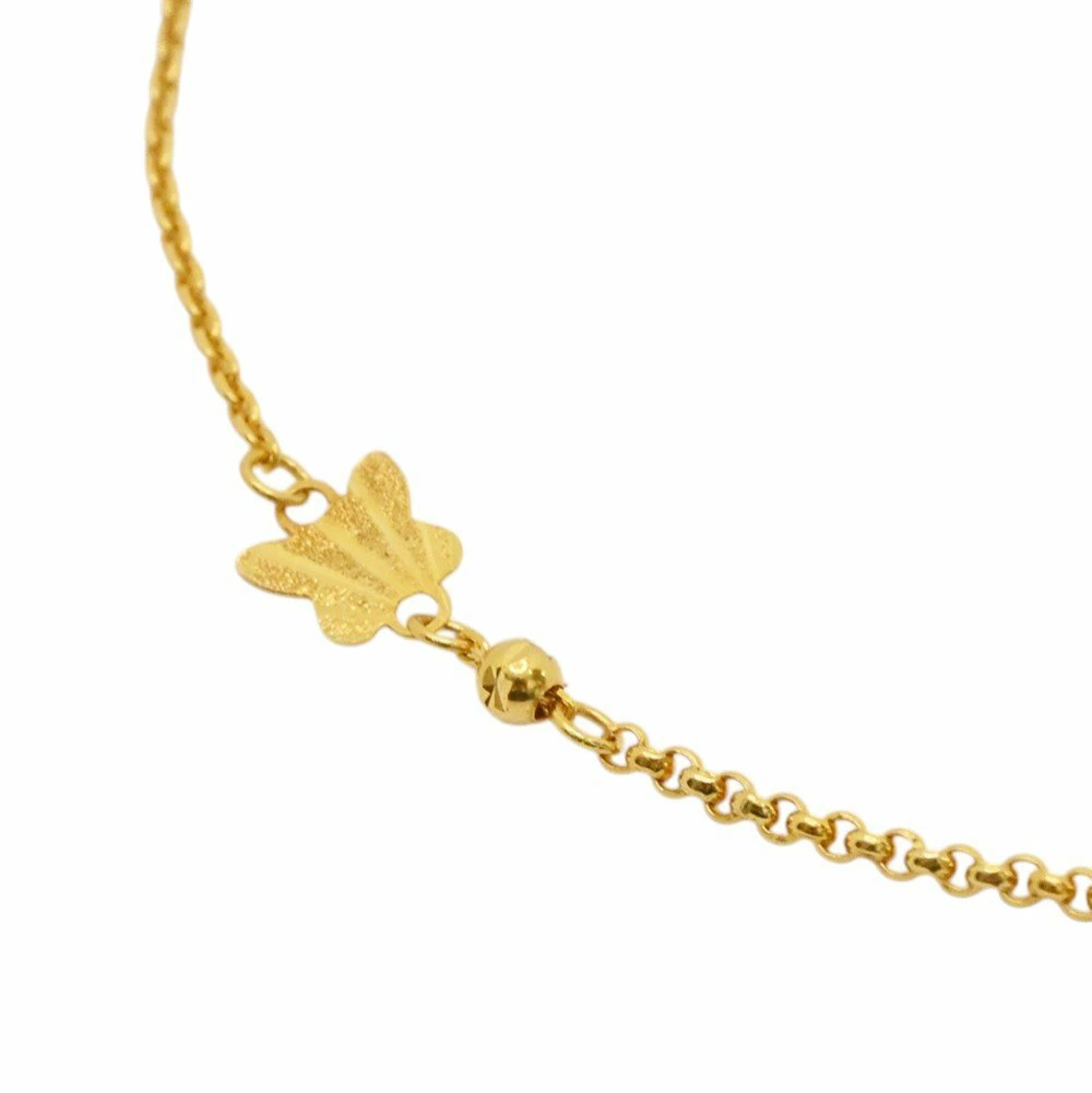 全長約17.7cm、そして驚くべきはその軽さ!約1.4gというストレスフリーな着け心地は、まるで着けているのを忘れてしまうほど。K18イエローゴールドの繊細なチェーンに、可愛らしいバタフライモチーフが等間隔に並んだステーションデザインは、動くたびにキラキラと輝き、手元に上品な華やかさを添えてくれます。