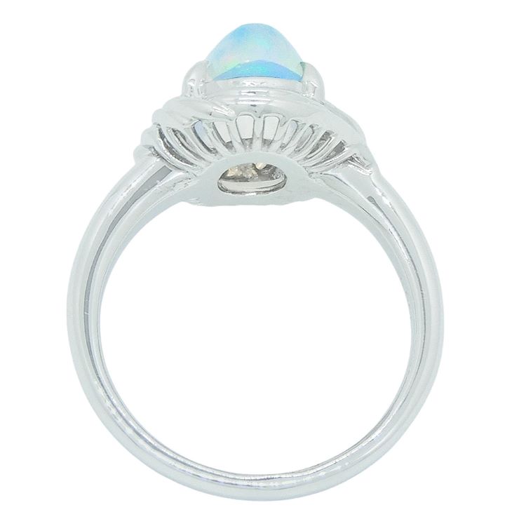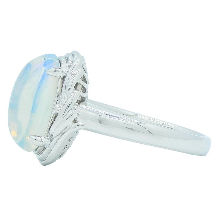透かし彫りの台座: 石の裏側からも光を取り込む設計になっており、オパールの透明感をより一層際立たせています。
