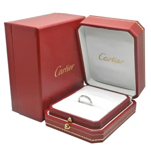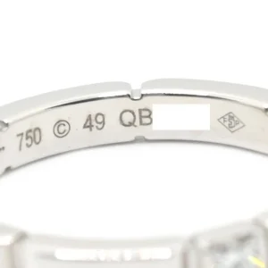 多色使いせず、ホワイトゴールドとダイヤのみで構成されているため、お手持ちのジュエリーとの重ね付けも相性抜群です。刻印(750、サイズ、シリアル、ホールマーク)も鮮明に残っており、カルティエのクラフトマンシップを直接感じることができます。