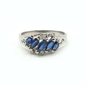 今回ご紹介するのは、シャープなフォルムが美しいマーキスカットの青色石を贅沢に5石並べたリ