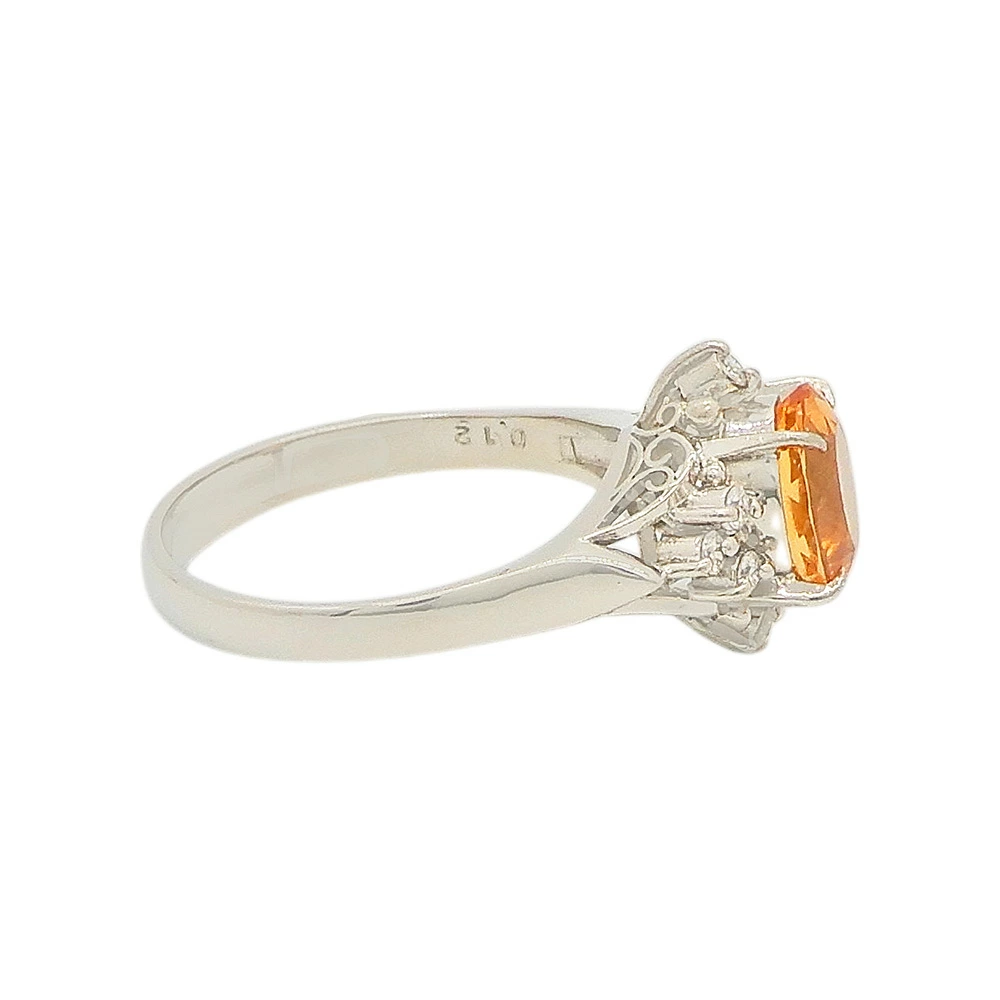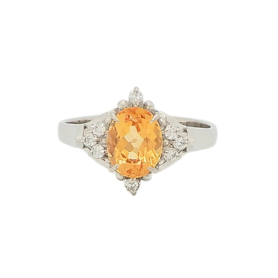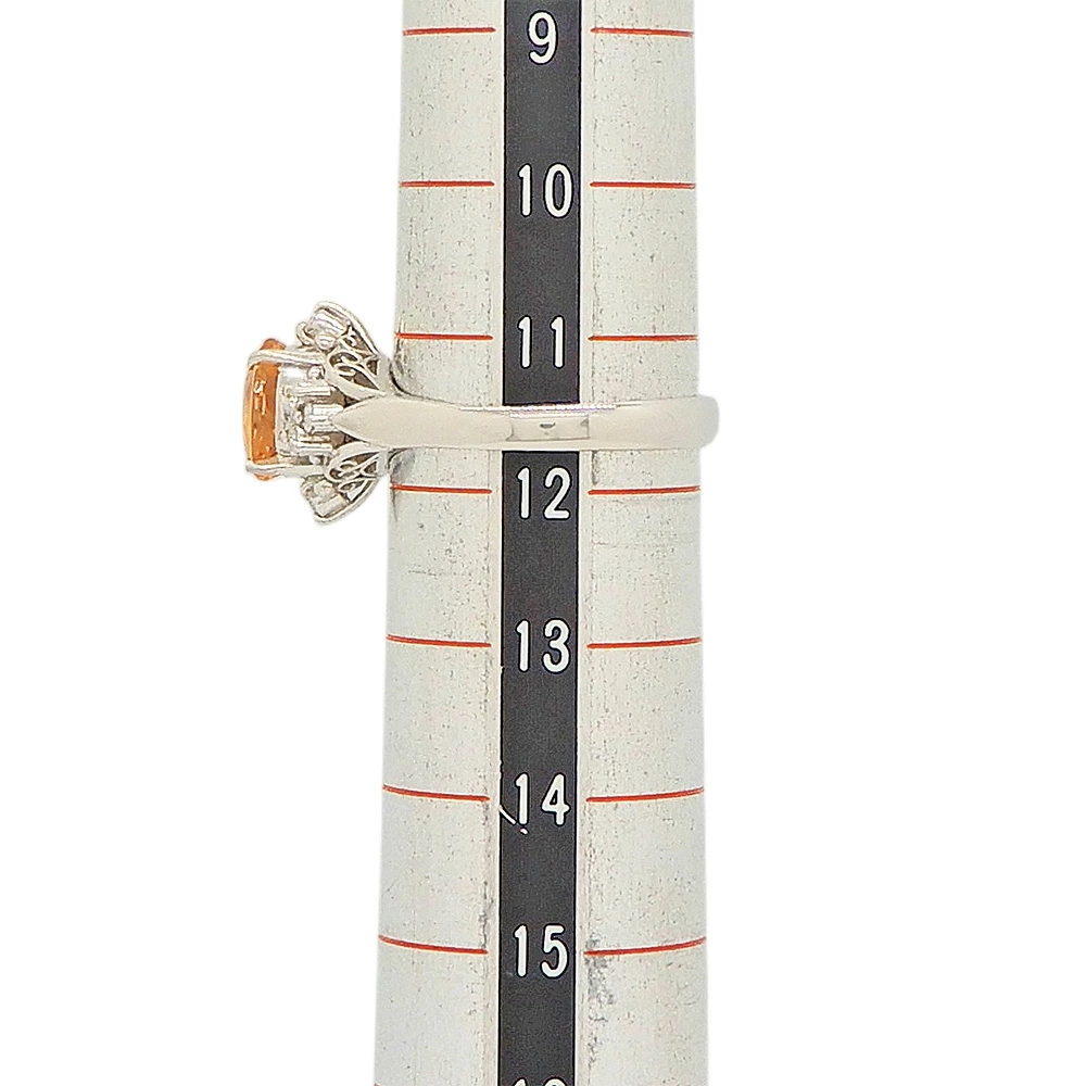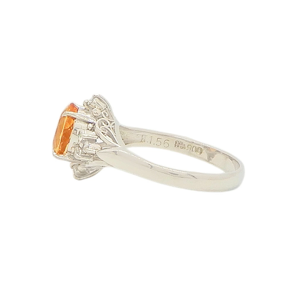 脇石(ダイヤモンド):0.12ct シトリンを囲むように配置されたメレダイヤが、メイン石のオレンジをより一層引き立てています。繊細な透かし彫りのような台座デザインも、高級感を感じさせるポイントです。